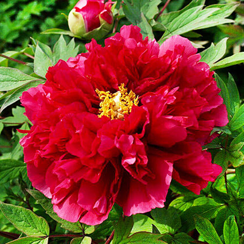 Великолепный пион Као древовидный способен достичь высоты 120-150 см. Его крупные густомахровые соцветия диаметром 20-25 см с желтой сердцевиной поражают удивительными оттенками рубина, пурпура и коралла. Обильно цветет в мае 8-15 дней, окутывая сад легким пряным ароматом.